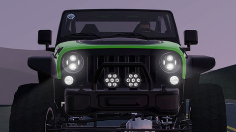 Vinyl roof and decals, "open-top" body style, door delete, two-seater, lifted suspension, custom rims and large off-road tires, custom headlights, blacked out trim, new bumpers, and more compared to our standard Jeep Wrangler.